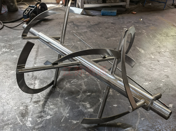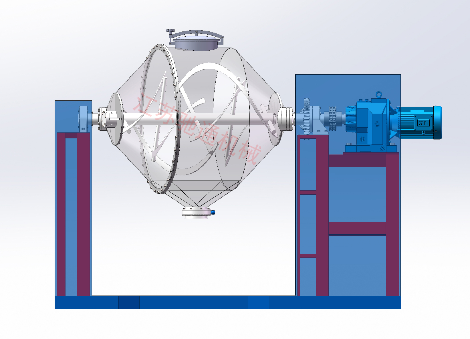 SYD型雙向動力混合機由料桶、機架、減速傳動、攪拌葉片等構成。該機的工作過程是:把需混合的幾種物料通過真空輸送或人工加料投放到水平雙錐體內,上好筒蓋,開起設備,雙錐筒及攪拌葉片同時轉動,旋轉的雙錐筒使筒體內物料產生紊亂翻滾混合,高速旋轉的攪拌葉片打碎結團物料,使物料在筒體內快速混合。SYD型雙向動力混合機工作過程無死角,無沉積,可使混合的物料快速達到均勻一致的效果。
