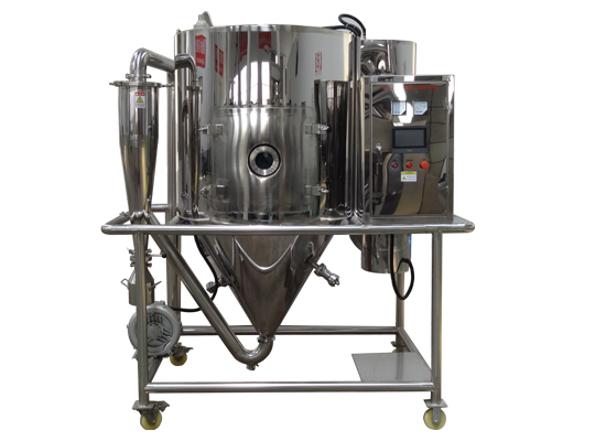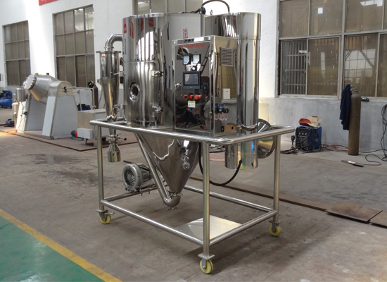 空氣經過濾和加熱,進入干燥器頂部空氣分配器,熱空氣呈螺旋狀均勻地進入干燥室。料液經塔體頂部的高速離心霧化器,(旋轉)噴霧成極細微的霧狀液珠,與熱空氣并流接觸在極短的時間內可干燥為成品。成品連續地由干燥塔底部和旋風分離器中輸出,廢氣由風機排空。