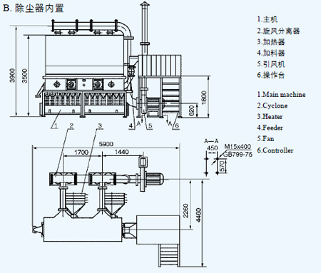 ● 沸騰干燥,又稱流化床,它是由空氣過濾器、加熱器、沸騰床主機,旋風分離器、布袋除塵器、高壓離心風機、操作臺組成,由于干燥物料的性質不同,配套除塵設備時,可按需要考慮,可同時選擇旋風分離器、布袋除塵器,也可選擇其中一種,一般來說比重較大的如沖劑及顆粒物料干燥只需選擇旋風分離器,比重較輕的小顆粒狀和粉狀物料需配套布袋除塵器,并備有氣力送料裝置及皮帶輸送機供選擇。